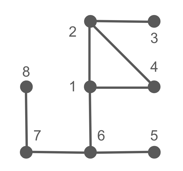 각 점에서 다음 점으로 연결된 지점으로만 갈 수 있고, 이 때의 확률은 1/시작점에 연결된 선 개수 이다. 예를 들어 1에서 2로 이동할 확률은, 1에 연결된 선이 3개이므로 1/3이다. 이 graph에서 random walk의 transition matrix는