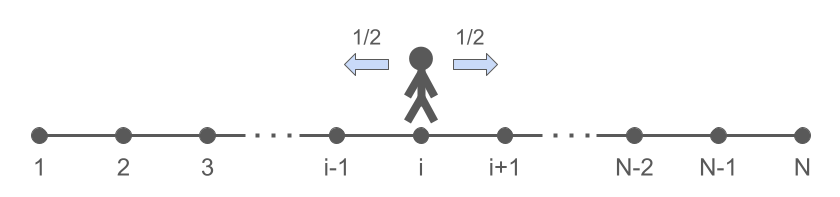 이 사람이 \(t\) 시점에 \(i\) 위치에 있었을 때, \(t+1\) 시점에는 왼쪽으로 이동, 즉 \(i-1\) 위치에 있을 확률이 1/2, 오른쪽으로 이동, 즉 \(i+1\) 위치에 있을 확률이 1/2이다. 즉, transition probability \(p(i,i-1) = \frac{1}{2}\), \(p(i,i+1) = \frac{1}{2}\) 이다.