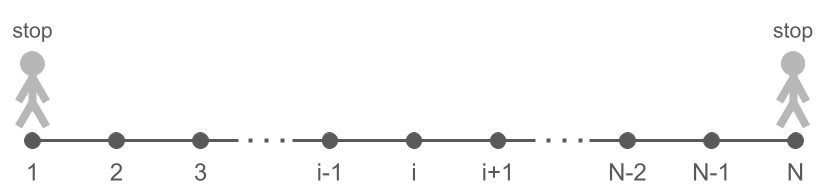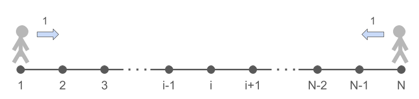 한 사람이 다음 그림과 같이 길게 연결된 N개의 점 위에서 시간이 지날때마다 왼쪽 또는 오른쪽으로 움직이는 상황을 생각해보자. \(t\) 시점에 이 사람이 있는 위치를 \(X_t\) 라고 하자. 예를 들어 \(X_3=N-2\) 는 \(t=3\) 시점에 이 사람이 서있는 곳이 \(N-2\)라는 뜻이다.